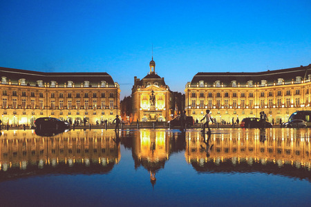 Imposing building with columns and stairs leading up to the entrance at dusk