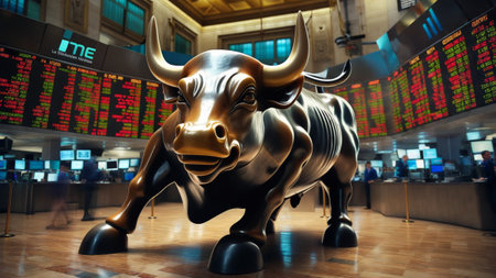 Bronze bull statue representing a rising market, conveying strength, optimism, and positive financial trends in the stock exchange