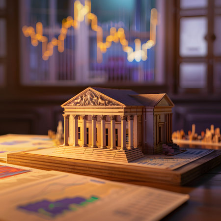 Bank model on table and stock chart or financial data background, use of fiscal policy by central banks and the increase in interest rates