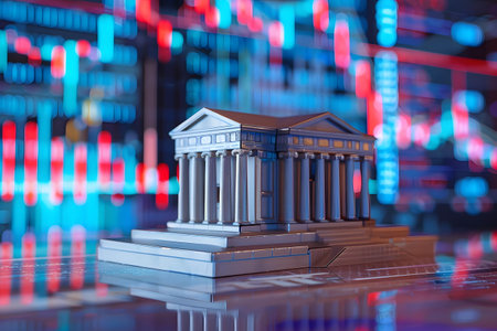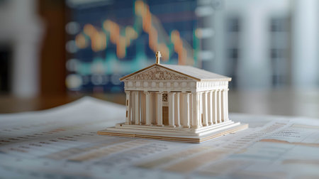 bank model on the table with stock market background, financial institutions that control monetary and fiscal policy and interest rate