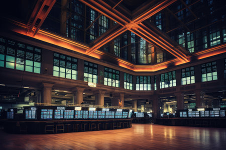 Inside a bustling stock exchange with traders active at work during a busy trading session in the late afternoon