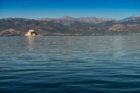 View of island and Bourtzi fortress from Nafplion on Peloponnese in Greece