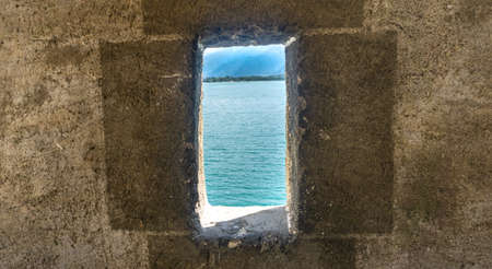 Narrow hole in the fortress wall. View of the blue lakewith green hills. May be an illustration of a narrow look. The concept of limitation.