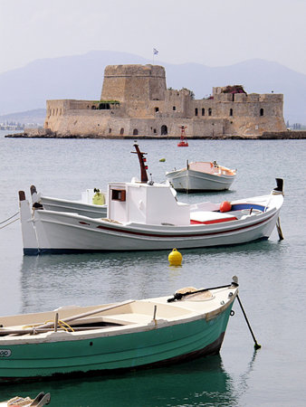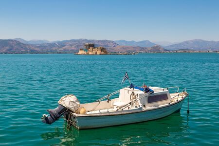Fishing boats and Bourtzi castle in the Nafplio harbour in Peloponnese peninsula, Greece.