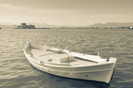 Old-fashioned sepia toned traditional style Mediterranean small boat afloat on sea at Nafplio with fortress on Bourtzi Island in background.
