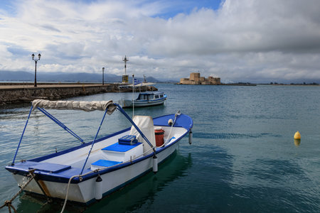 Traditional fishing boat anchored in Nafplio harbor with view of Bourtzi fortress on a cloudy day, Greece.