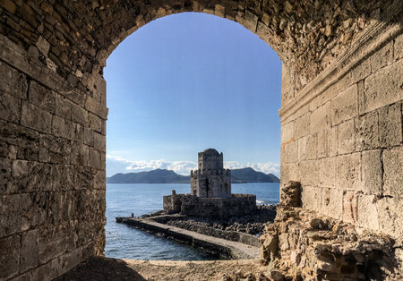 Bourtzi is a historic water castle on a small island off Nafplio, Greece, featuring stone walls and turrets. Surrounded by the Aegean Sea, it offers a glimpse into Greece's maritime history