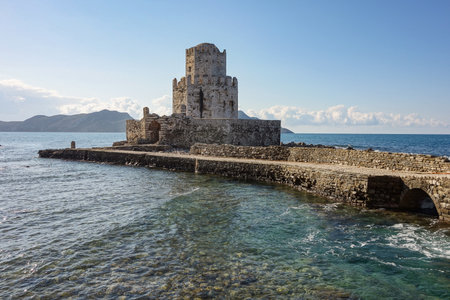 Methoni Castle with a bridge in sunny weather during early morning hours with water waves in Greece