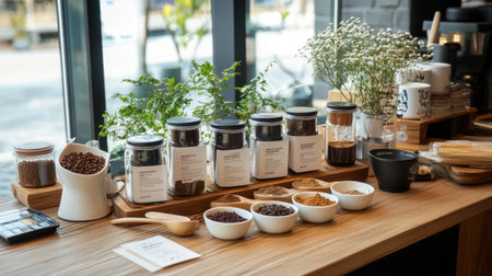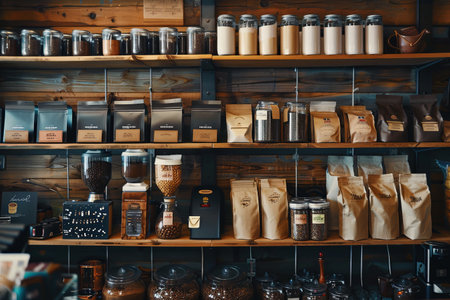Shelf display of various coffee beans and ingredients in a cozy coffee shop