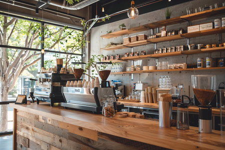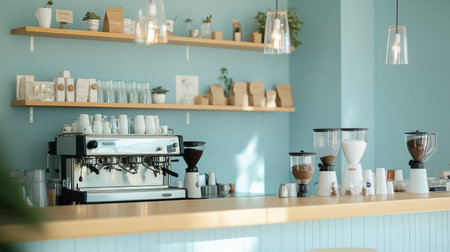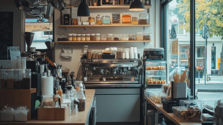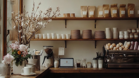 A beautifully designed coffee shop with an espresso machine, shelves filled with ingredients, and inviting natural light, creating a warm and cozy atmosphere for guests.