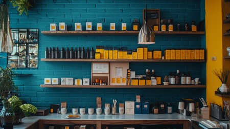 A stylish retail shop interior showcasing neatly arranged products on wooden shelves, with a modern teal and yellow design and hanging lights.