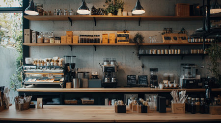 A charming coffee shop interior featuring a well-equipped barista counter, cozy decor, and a variety of coffee-related items, perfect for coffee lovers.