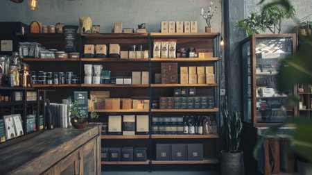 Coffee shop interior featuring modern design and coffee preparation area with shelves of merchandise