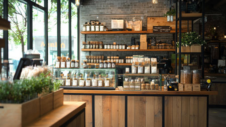 An inviting spice shop with wooden shelves filled with jars of spices, herbs, and other organic products. The natural light and organized layout create a cozy and eco-friendly shopping ambiance.