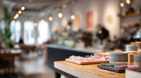 Boutique hybrid retail outlet captured in medium shot featuring detailed handcrafted accessories sharply in focus with the outoffocus cafe counter suggesting a seamless blend of