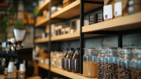 A cozy cafe interior with jars of ingredients and coffee equipment on wooden shelves, creating a warm and inviting ambiance.