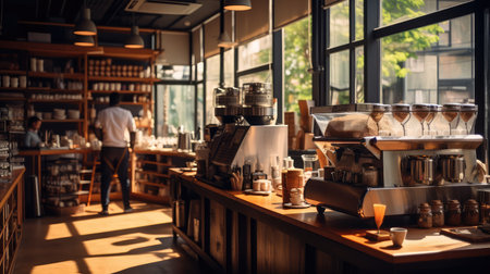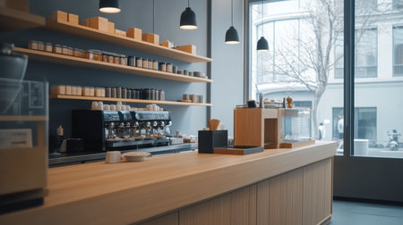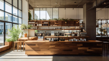 Coffee shop in the heart of downtown, the warmth of wood furniture and natural light. this coffee shop offers a serene retreat from the bustling city streets.