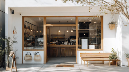 Bright and airy cafe exterior with a clean white wall, elegant glass storefront, and a rustic wooden bench outside.