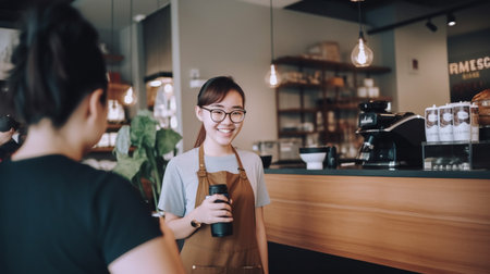 illustration of female barista with a 20 year old customer happy talk in the coffee shop with Generative AI