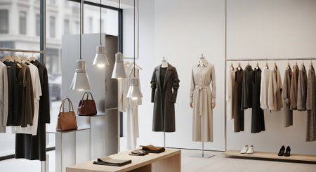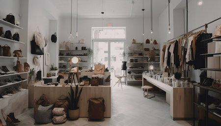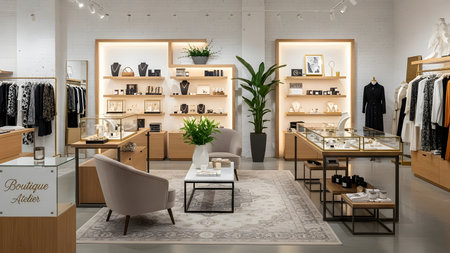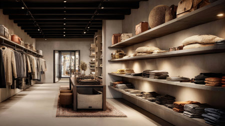 Elegant boutique interior showcasing a selection of designer clothing, shoes, and accessories under warm, inviting lighting. AI Generation