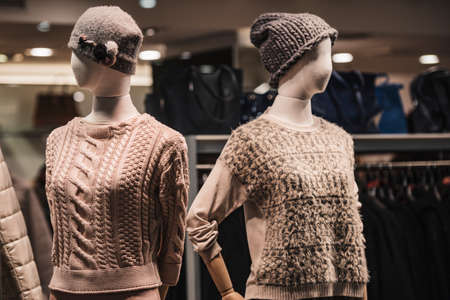 Moscow, Russia 12 22 2021 Style female mannequins show autumn winter spring clothes collection. Standing dummies in casual and modern style in store