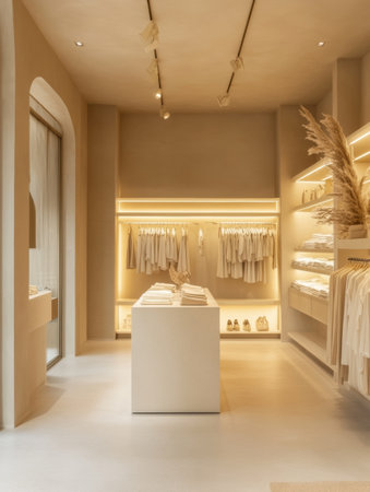 Soft beige tones and modern furniture create a soothing atmosphere in a minimalist clothing store filled with stylish apparel.