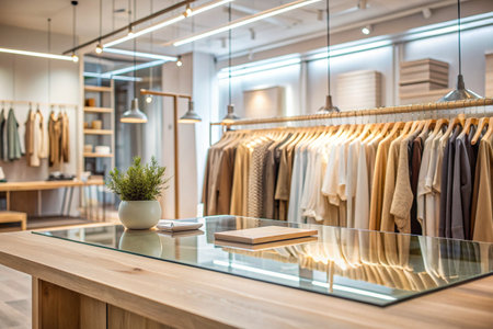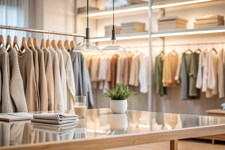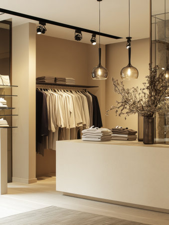 This image showcases a modern boutique interior featuring neatly arranged clothing and accessories, enhancing a warm and inviting shopping atmosphere. Ideal for fashion-related projects.