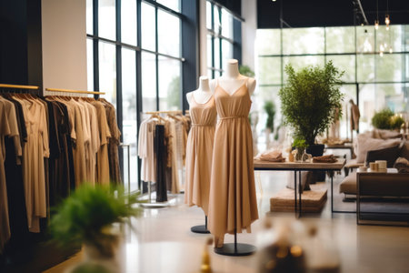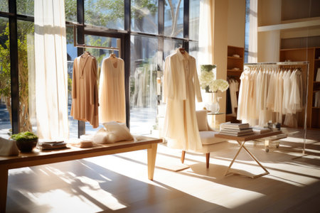 Fashion clothes in a trendy luxury boutique store. AI generated illustration