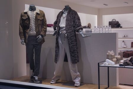 Mannequins with women's and men's clothing in the window of a luxury store. Fashion and sales