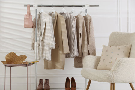 Different stylish clothes hanging on rack, accessories, shoes and armchair near white wall indoors