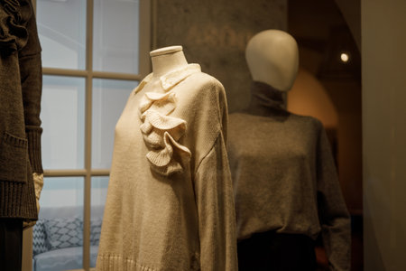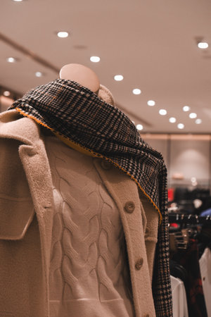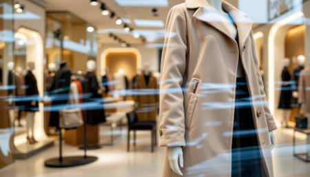 A beige coat on mannequin in modern clothing store with blurred background and warm lighting creating cozy mood