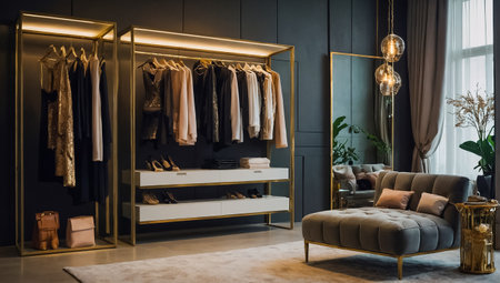 Modern boutique showcases fashionable clothing collection in elegant domestic room generated by artificial intelligence
