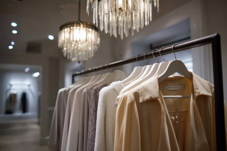 Stylish clothing displayed on hangers in a luxurious retail store, illuminated by beautiful crystal chandeliers, creating a sophisticated shopping atmosphere