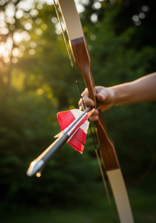 A closeup shot of a person holding a bow and arrow with a blurred background