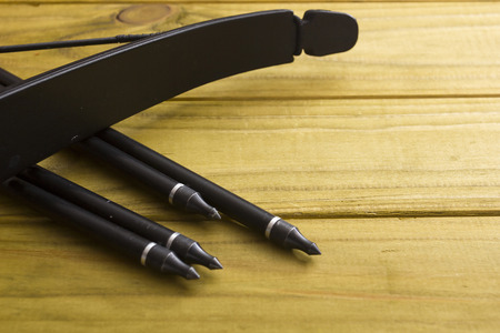 Plastic arrows and bow on gray wooden table, flat lay. archery sports equipment