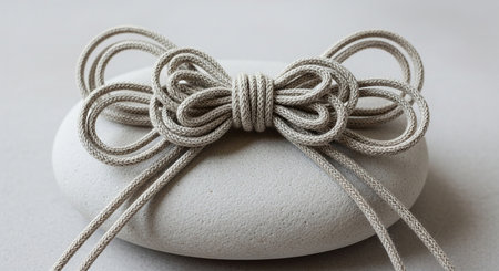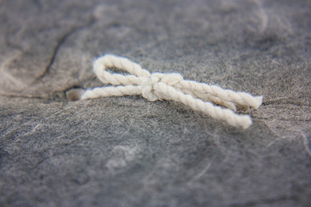 A gray cord is tied into a bow shape and placed on a smooth white stone. Clear details and vibrant colors enha...