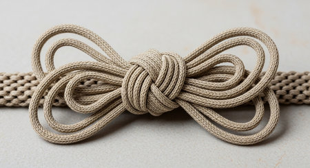 A tan rope is tied into a bow shape, resting on a textured surface. Clear details and vibrant colors enhance v...