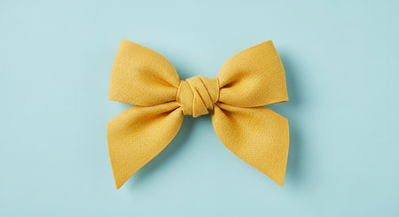 A bright yellow linen bow with a knot and pointed ends is centered on a light blue background.