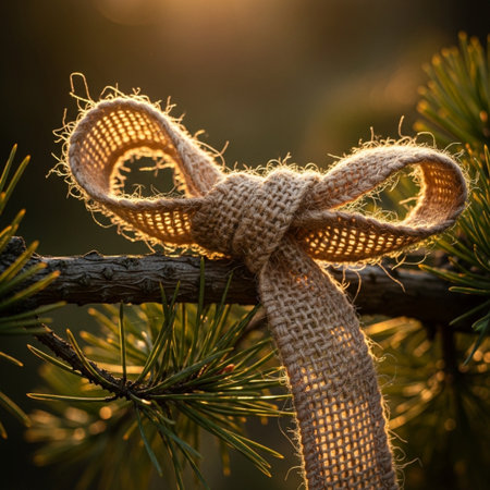 A detailed view of a textured, rustic Christmas bow adorned with floral motifs, attached to a dark green pine tree branch, evoking a festive holiday mood.