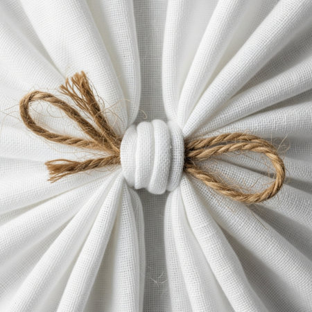 A detailed close up shot of a thick, rustic natural jute twine tied into an intricate bow knot, showcasing its texture and strength. ideal for themes of connection, security, or craftsmanship.