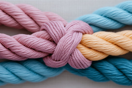 Strong climbing knot with pastel colored ropes on clean light background. Team building concept. Generative AI.