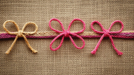 This image features vibrant fabric bows in pink and yellow, artfully arranged on a rustic burlap background, perfect for crafts, gift wrapping, or decorative projects.