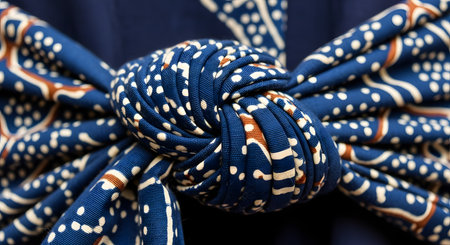 A close-up macro shot of a large, tight knot tied in a blue fabric. The textile features a traditional Indonesian or Javanese batik pattern with white and brown dots. The image highlights the texture and detail of the fabric.