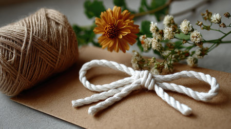 A serene crafting scene featuring twine shaped into a bow, accompanied by dried flowers and a brown envelope, perfect for DIY gifts and artistic projects.
