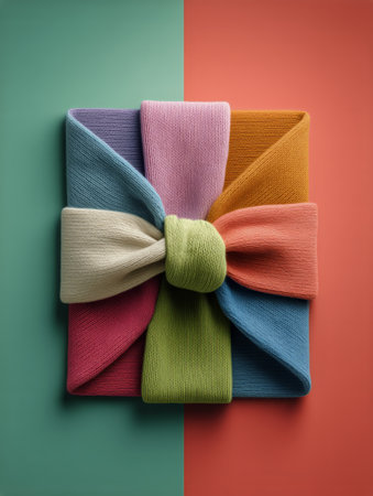 A vibrant arrangement showcases a gift wrapped in assorted fabric colors, creating an eye-catching design. The creative bow ties together the colorful elements for a unique presentation.