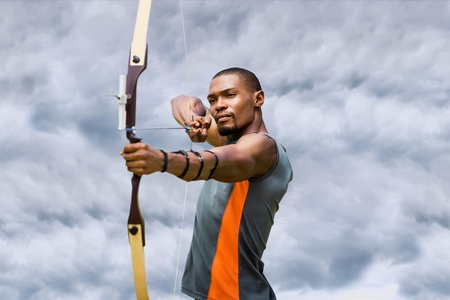 Tough man with bow and arrows, close up with cloudy sky at background.
