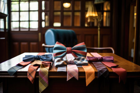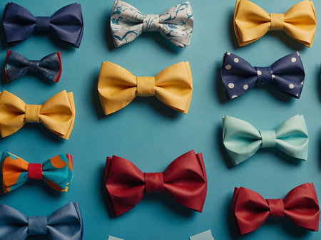 variety of patterned bow ties spread flat on a table, created with generative ai
