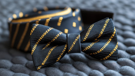 A close-up of an elegant striped bow tie resting on a shimmering black surface, emphasizing its pattern and texture.