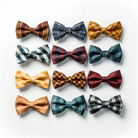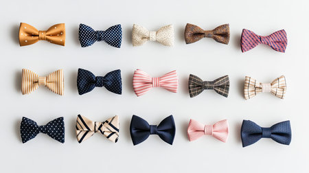 A creative assortment of bow ties displayed on a white background, showcasing a variety of colors, patterns, and styles ideal for fashion photography or accessories promotion.