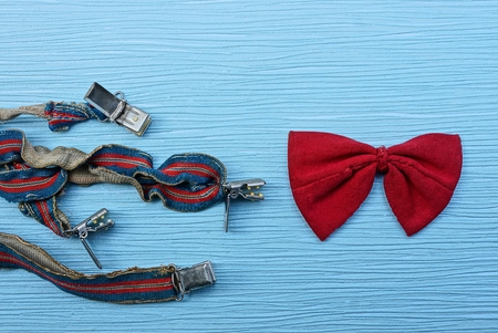 Men's accessories, bow tie top view, flat lay on wooden board background